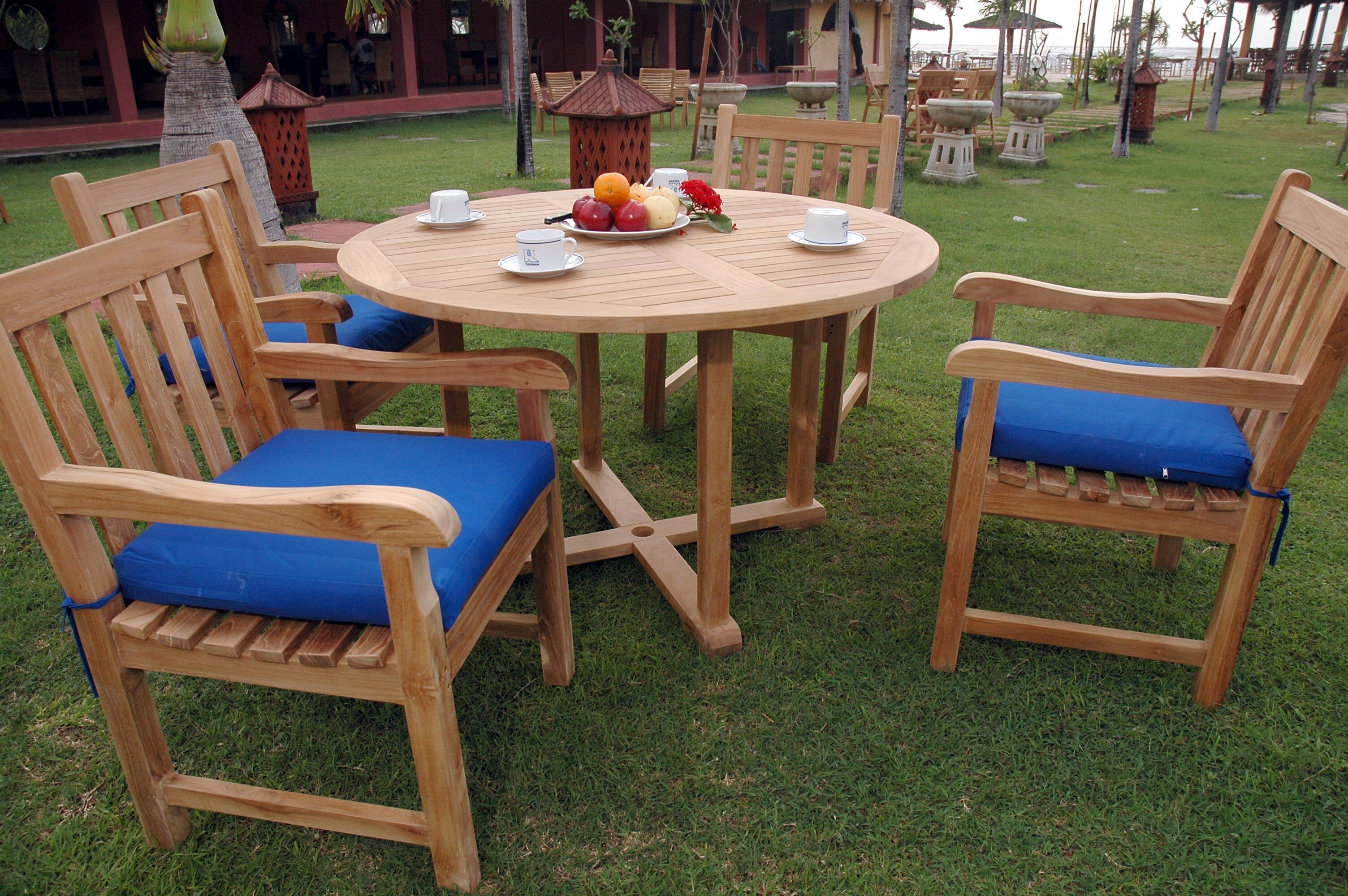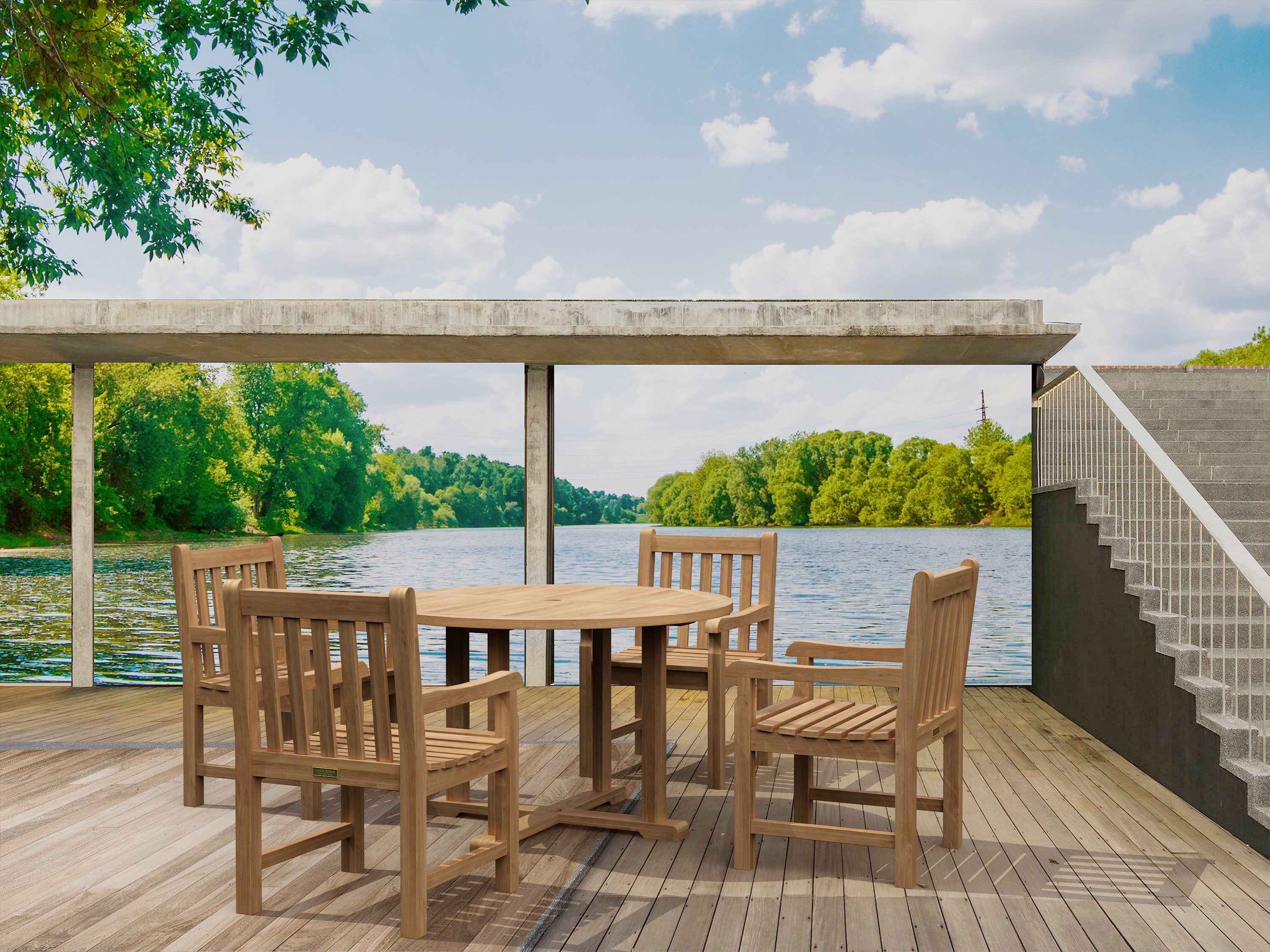 This traditional-style Tosca Dining Set has an ideal design for dining and relaxation in your garden or home. These simple and classic armchairs have contoured seats on it that add support and comfort. The solid construction and beautiful, traditional design will surely provide your yard and home with many years of outdoor recreation. This intimate dining set comes with the 47" Tosca Round Table and four Classic Dining Armchairs, all constructed from premium grade unfinished teak.